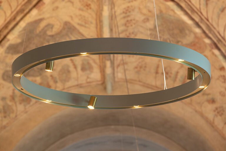 Spånga kyrka har fått en ny kompletterande belysning med specialdesignade ljusringar, dessa har monterats i kyrkorummets kryssvalv som tydligt synliggör kyrkans väldekorerade väggmålningar.